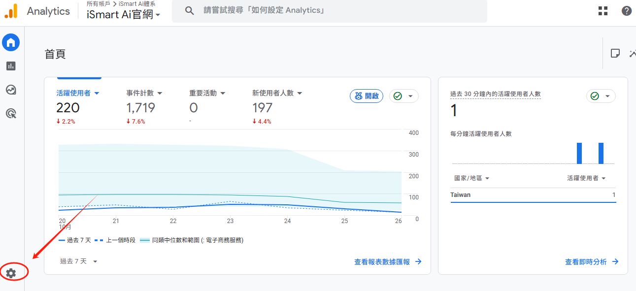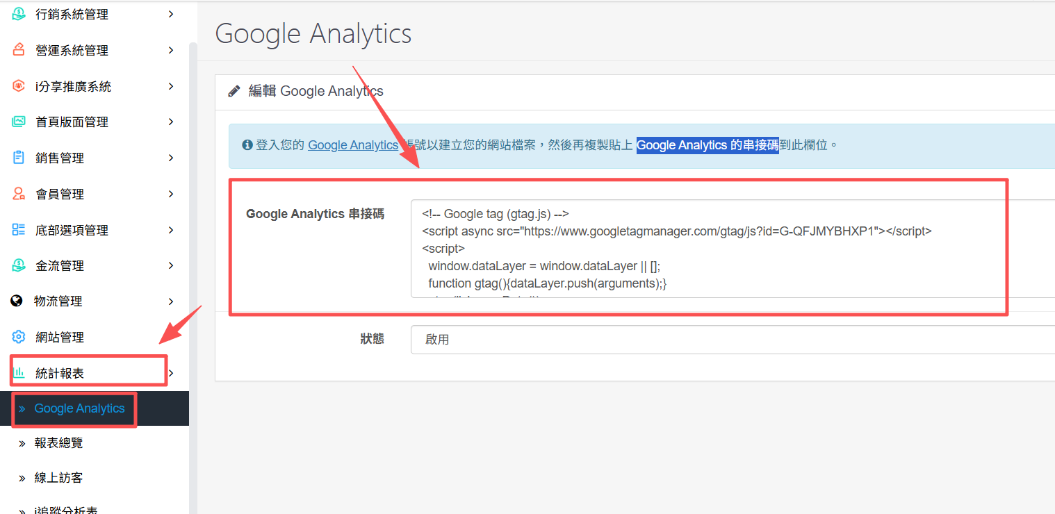 5.選擇統計報表的"Google Analytics設定",貼上代碼後記得"存檔"