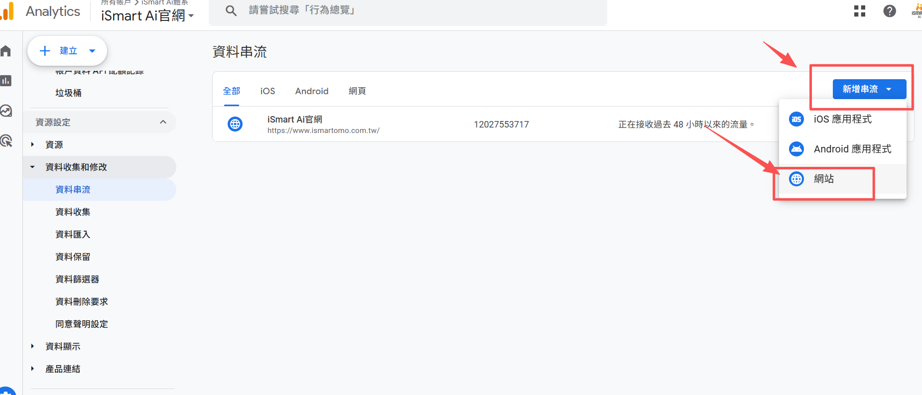 2.點選"資料收集與修改"下面的"資料串接",再點選"新增串流","選擇網站"