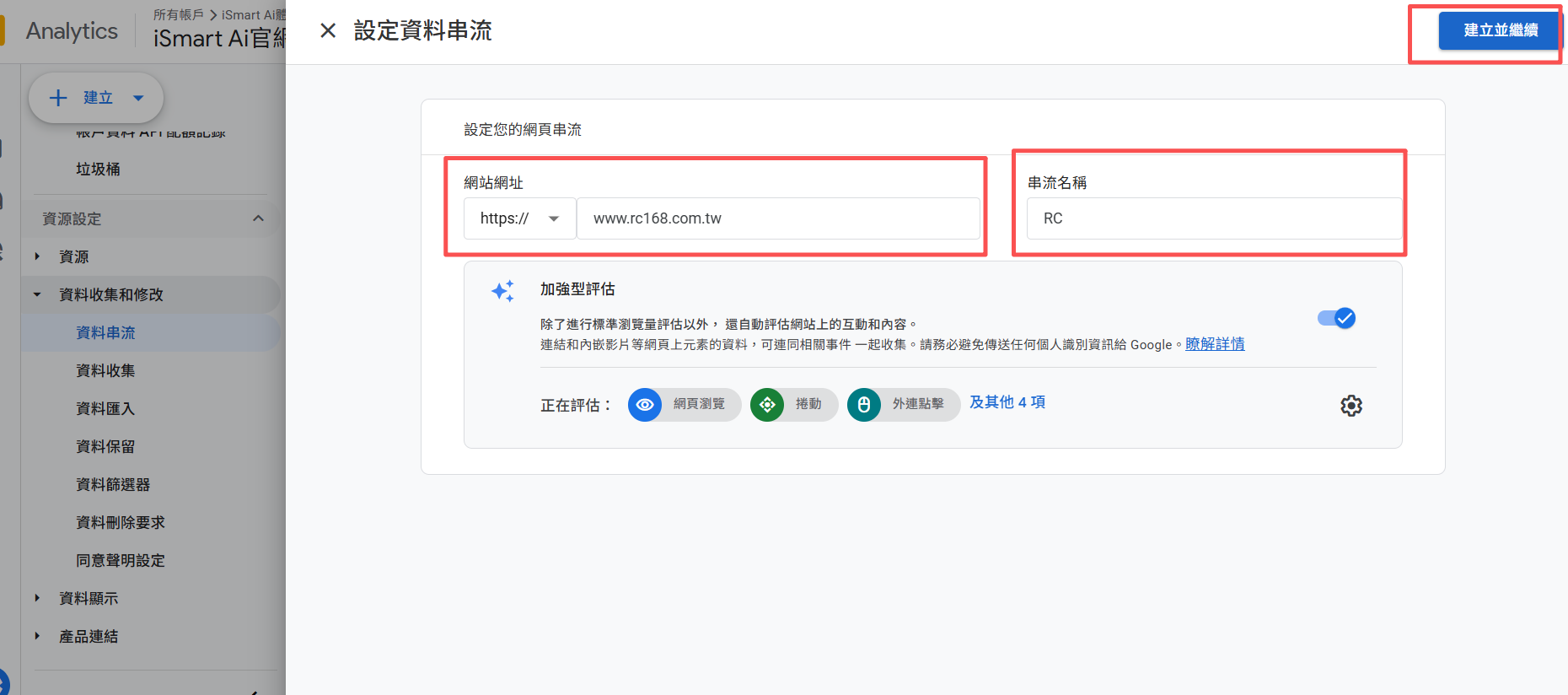 3.填入網址與串流名稱(自行命名),再點選"建立並繼續"