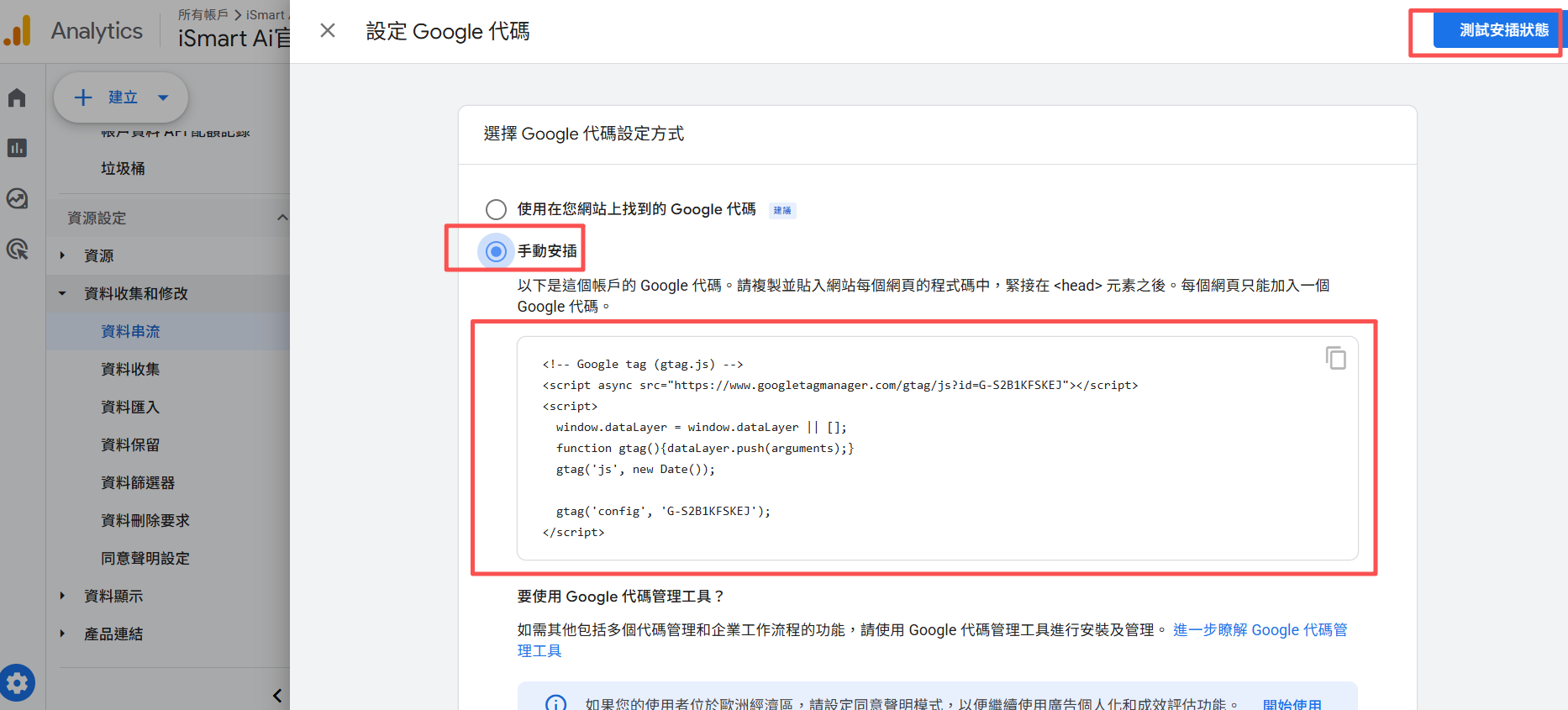4.選擇"手動安插",將代碼貼到網站後,再點選安插狀態